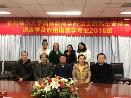 本届毕业论文答辩委员会由浙江大学池昌海教授和彭利贞教授、杭州师范大学人文学院徐越教授、我院姜黎黎副教授和凌瑜副教授等5人组成,池昌海教授任答辩委员会主席。王文胜副院长致开场词,我院2017、2018两个年级同专业的外籍硕士研究生旁听了此次答辩。会后,吴晓维书记代表学院对外校(院)专家的到来表示感谢,并与大家一起合影留念。
