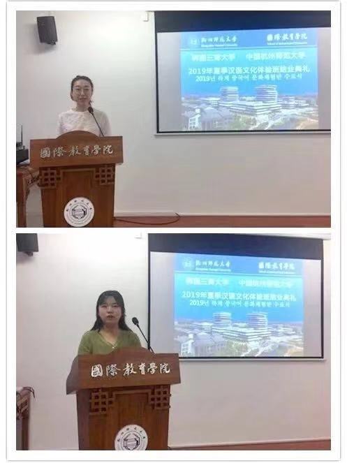 国教院李泊洋老师作为教师代表发言,她为学生们取得的优异成绩感到骄傲,并逐一描述了自己心目中每个学生的形象,引得现场一阵阵掌声和欢笑。学生代表李铉嬉用中文总结了在杭师大学习期间的收获,她表示通过此次交流学习,同学们不仅汉语水平有了飞速的进步,而且全面了解了在淘宝平台创业的过程与步骤,回到韩国后非常愿意把在这里所学到的知识付诸于行动。