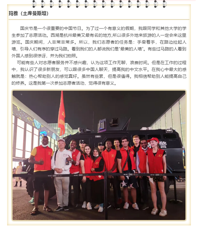 每个重要节假日,美丽的西子湖畔,总会出现一道最美人墙,这个国庆中秋长假也不例外。这次国庆中秋双节参加志愿服务的,还有来自赞比亚、土库曼斯坦、索马里、也门、乌兹别克斯坦、埃塞俄比亚、巴基斯坦等14个国家的留学生来做志愿者。