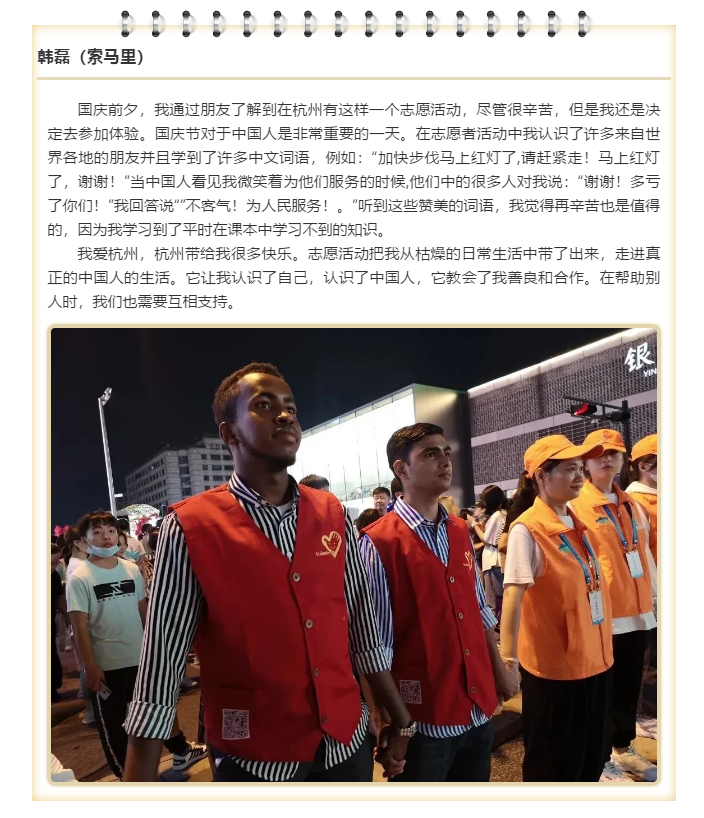 这次的志愿者中也有两名我院国际学生的身影,这个假期他们放弃了外出游玩,为杭州贡献了自己的一份力量。