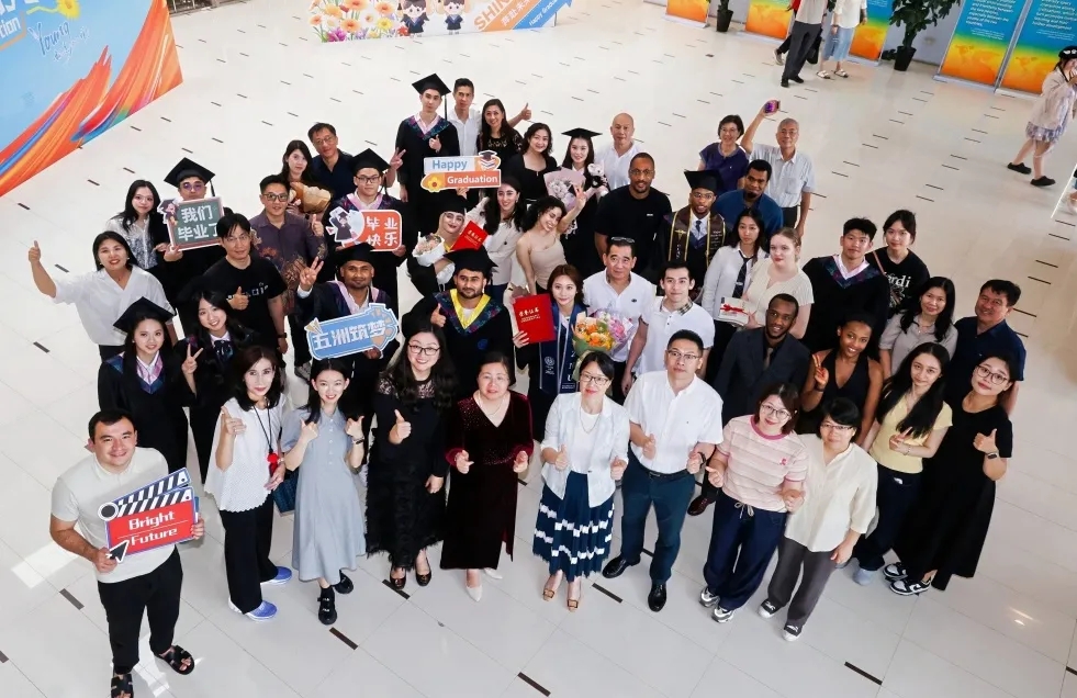 6月12日上午,杭州师范大学2025届毕业典礼暨学位授予仪式在叔同剧场隆重举行。24名国际学生顺利毕业,18名在校国际学生代表参加典礼和学位授予仪式。他们依次上台接受校领导拨穗,聆听校党委书记郭东风向全体毕业生发表题为 “路在脚下,踏歌而行”的讲话。