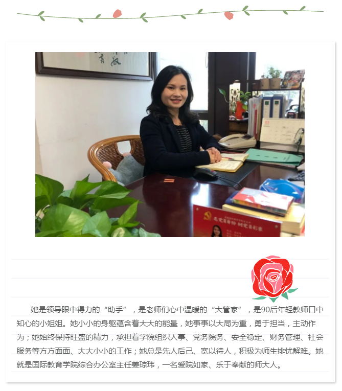 她始终以服务师生为工作宗旨,热情待人,细心待物,保持着良好的服务态度。对于老师们的需求,不管是份内还是份外的工作,她都做到不推诿,她总说:“我做的一点小事,可能会给老师带来便利,让他们节省更多的时间投入教学。我的一个笑脸,可能会带给人一天的好心情。”所以她始终保持着微笑,耐心处理师生们的各类问题。她宁可花费更多的个人时间,也要把工作做到位,确保服务的高质量。对于每项任务,她都热情地说:好的!总是主动承担更多的工作。院长说:“琼玮在这里的这一年,是我在杭师大最幸福的时光”。90后教师说:“姜老师做事有条理,执行力超强,对我如春风化雨,润物于心,是我学习的榜样!”。以前共过事的同事碰到困难时,第一个想到的还是她,寻求她的帮助,她也有求必应。